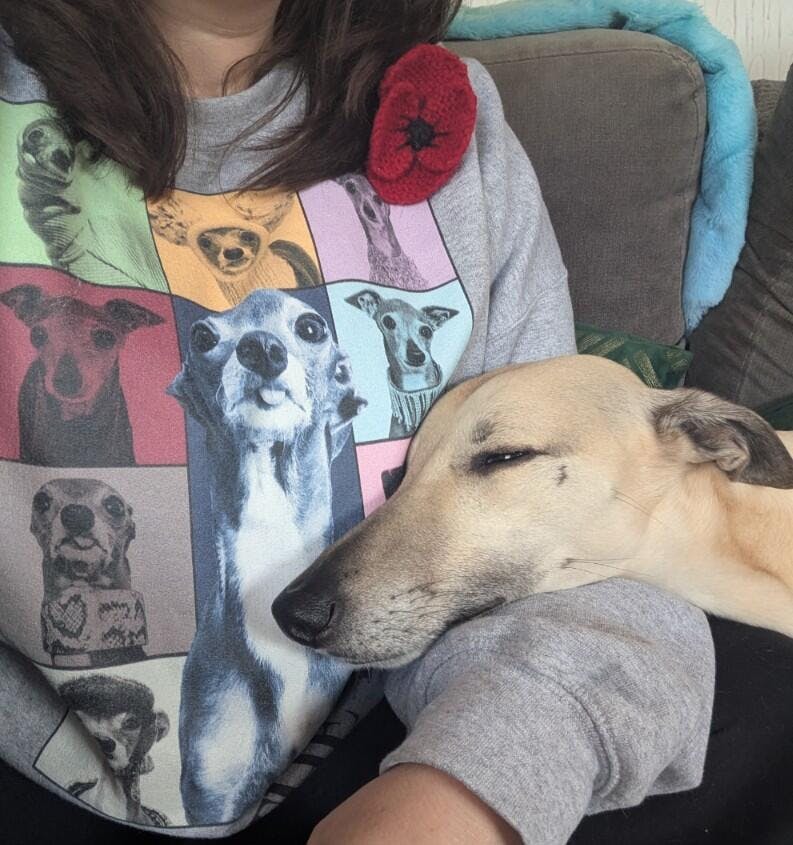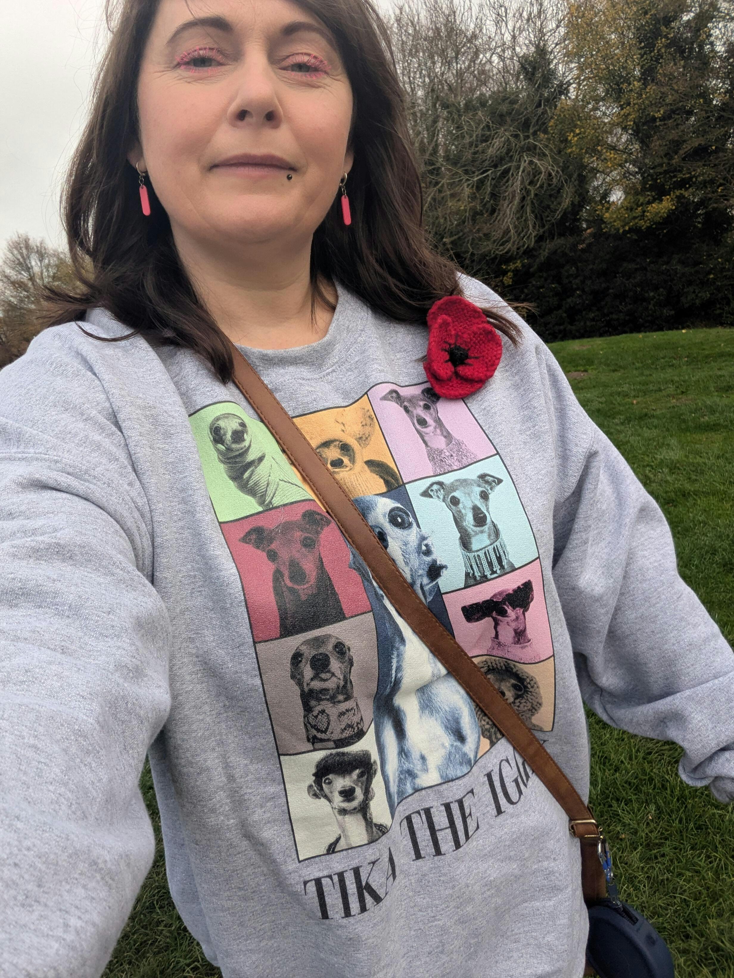 My partner feels like my style is questionable at the best of times but even he loves my new sweater. I've been wearing it for dog walks with our lurchers. Perfect for the autumn weather in Norfolk, England and I sized up, so I could wear layers until. It's snuggly and happy. Beautiful, just like Tika 🐾